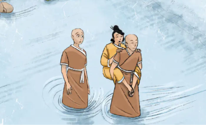 El primer monje no titubeó en ofrecerle su ayuda y, bajo la mirada atónita del otro, la cogió en brazos y la llevó al otro lado de la orilla. La dejó ahí, la saludó deseándole suerte y cada uno siguió su camino.